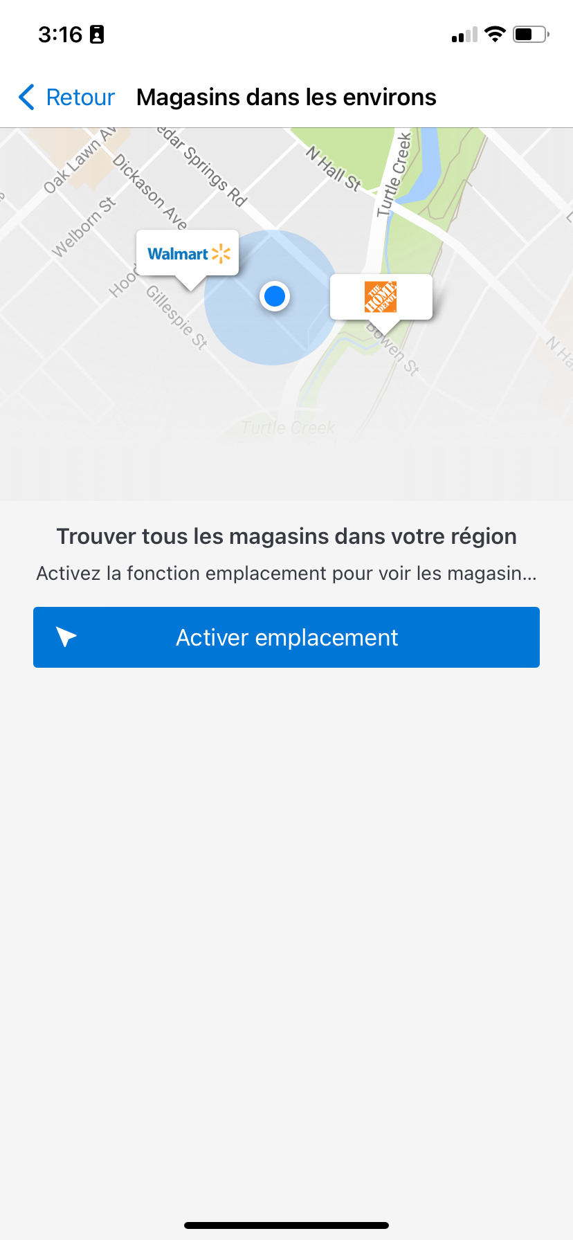 2. Sélectionnez "Trouver les magasins à proximité" (activez la fonction emplacement s'il n'est pas déjà activé).